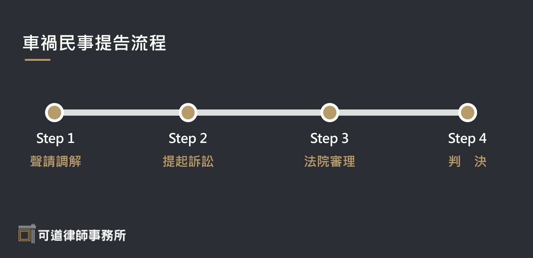 若當事人欲取得車禍金錢賠償,須選擇民事提告流程,向法院請求相應的賠償,以下說明提告流程: